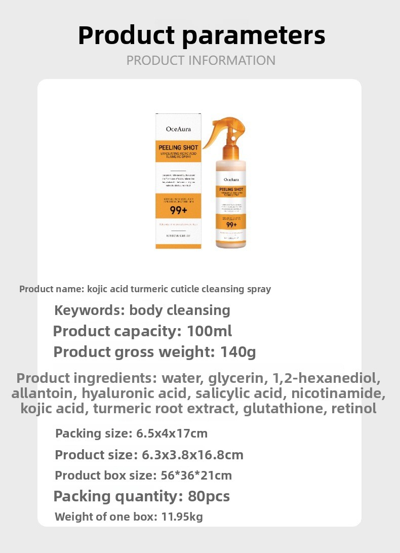 Dein Spray kombiniert die Kraft von Kojicsäure und Kurkuma, um abgestorbene Hautzellen zu entfernen und deine Haut sichtbar zu glätten. Gleichzeitig versorgt es sie mit reichhaltiger Feuchtigkeit, sodass sie sich weich, geschmeidig und rundum gepflegt anfühlt.